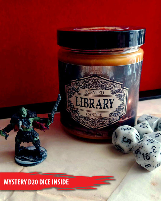 Scented Candle Library with Surprise D20 Dice